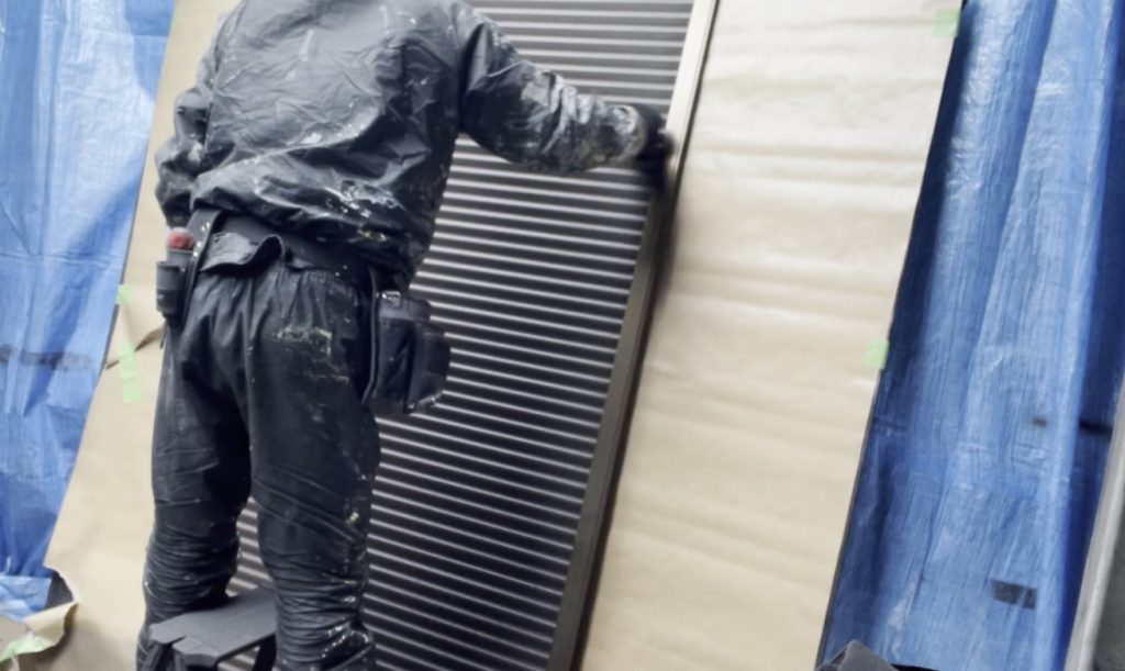 雨戸は蛇腹(じゃばら)状の複雑な形状をしており、角度を変えながら吹き付けや手塗りを行うため、養生の精度が仕上がりを大きく左右します。