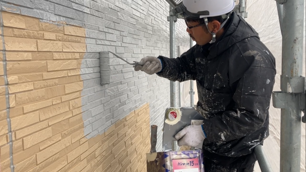 下側の外壁は目地の凹凸があるため、塗料が垂れないよう注意しながら作業を進めています。