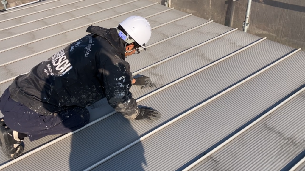 屋根を保護するための大切なベースとなる塗膜を作る工程です。