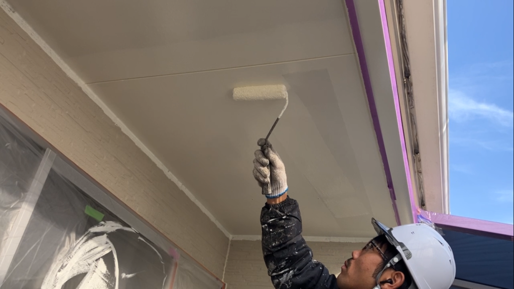 軒天井は下塗り・中塗り・上塗りの3回塗りで仕上げています。