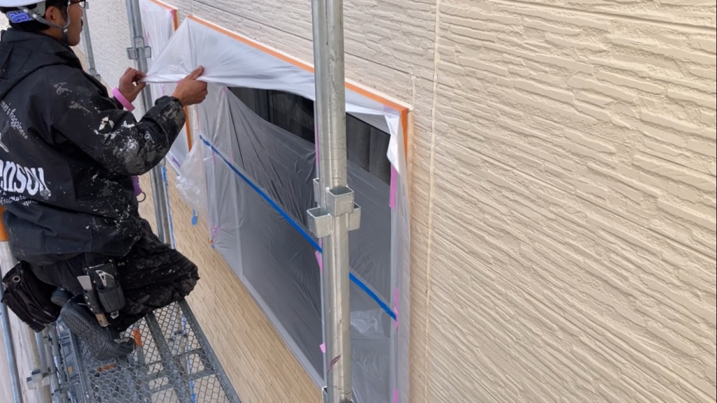 今回のお家は比較的形状がシンプルで、養生も貼りやすかったため、作業は順調に進みました。