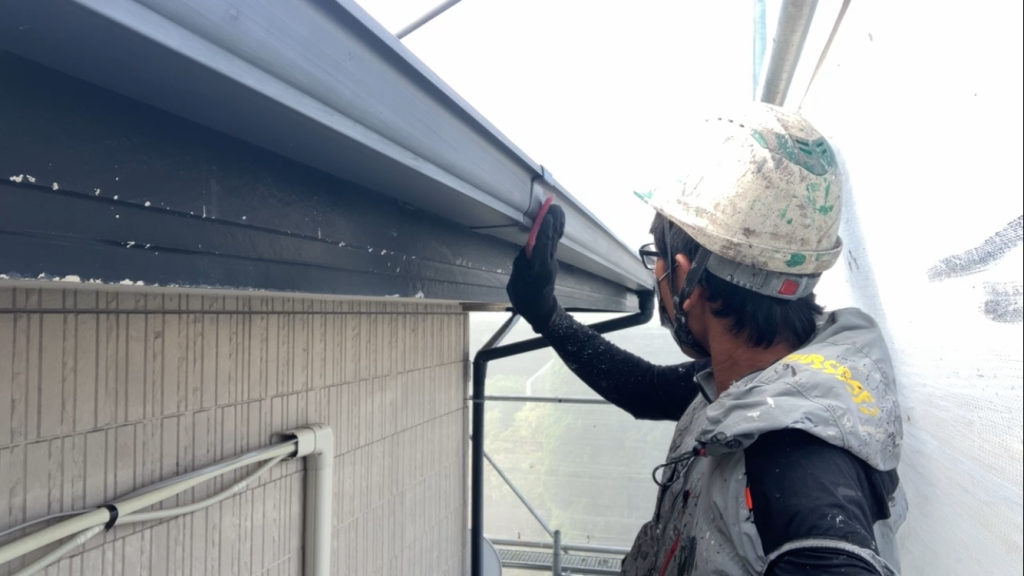 今日は軒樋や出窓板金など、付帯部の「目荒らし(ケレン)」作業を行いました。