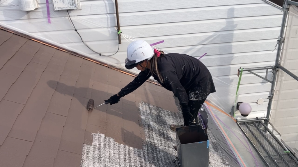 屋根は特に面積が広く、乾燥具合を見ながらの塗装になるため、二人いると効率が格段に上がります。