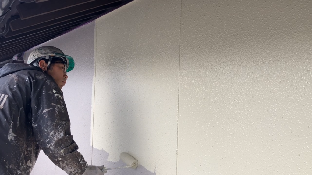 上塗りは外壁塗装の最終仕上げにあたる工程なので、一つひとつの面をしっかり確認しながらローラーを動かし、塗り残しや艶ムラが出ないよう細心の注意を払って進めました。