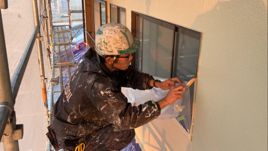 外壁と養生テープの境目を崩さないよう、角度を調整しながら慎重にはがしていくと、塗装面がより際立って見えます。