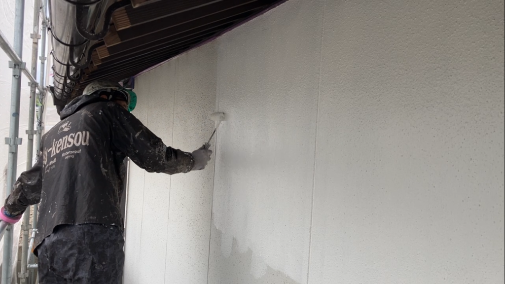 外壁の塗装は「下塗り → 中塗り → 上塗り」の順で仕上げていきますが、特に下塗りがきちんと入っていると、次の中塗りの段階でも塗料の伸びが違います。