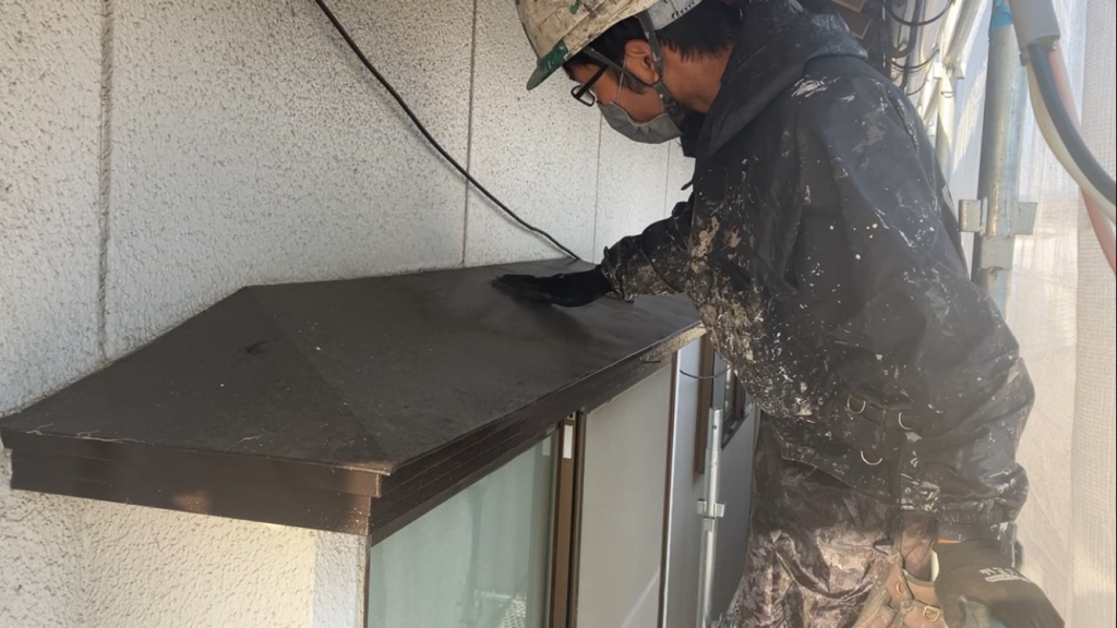 軒樋や出窓の板金部分などは、表面に細かい傷をつけるようにして塗料がしっかりと食いつくように処理しました。