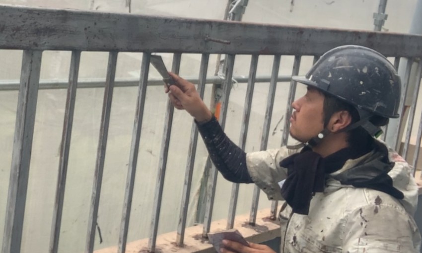本日は手摺り部分のケレン作業を実施し、皮スキとスコッチを使い分けて古い塗膜の除去と目荒しを行いました。