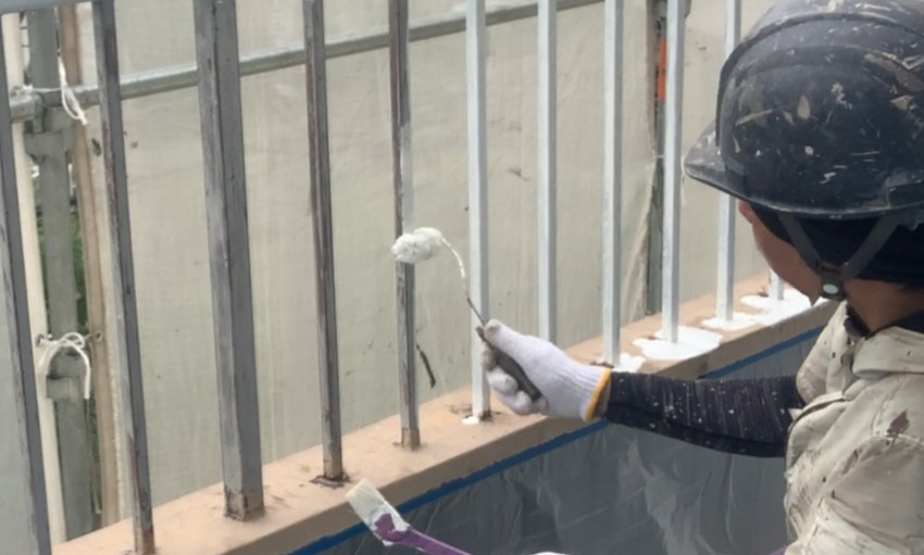 本日は手摺りの下塗り(サビ止め)を行い、鉄部を長期間保護するための強固な下地を整えました。