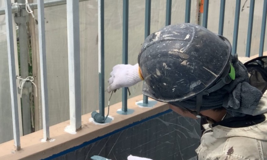 本日は手摺りの中塗りを行い、サビ止めで保護した下地の上に塗膜を重ね、仕上げに向けた強固な基盤を整えました。