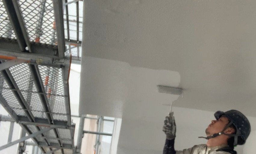 本日は軒天井の上塗り作業を行い、下塗り・中塗りと重ねた塗膜を最終的に美しく仕上げました。