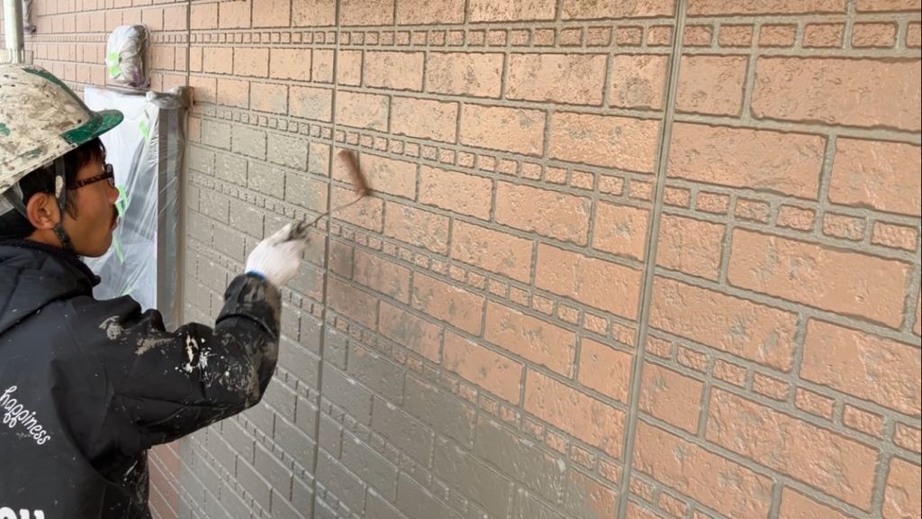 これまで下塗り・中塗り・上塗りと工程を重ねてきた外壁に、いよいよデザイン性を加える仕上げの作業です。