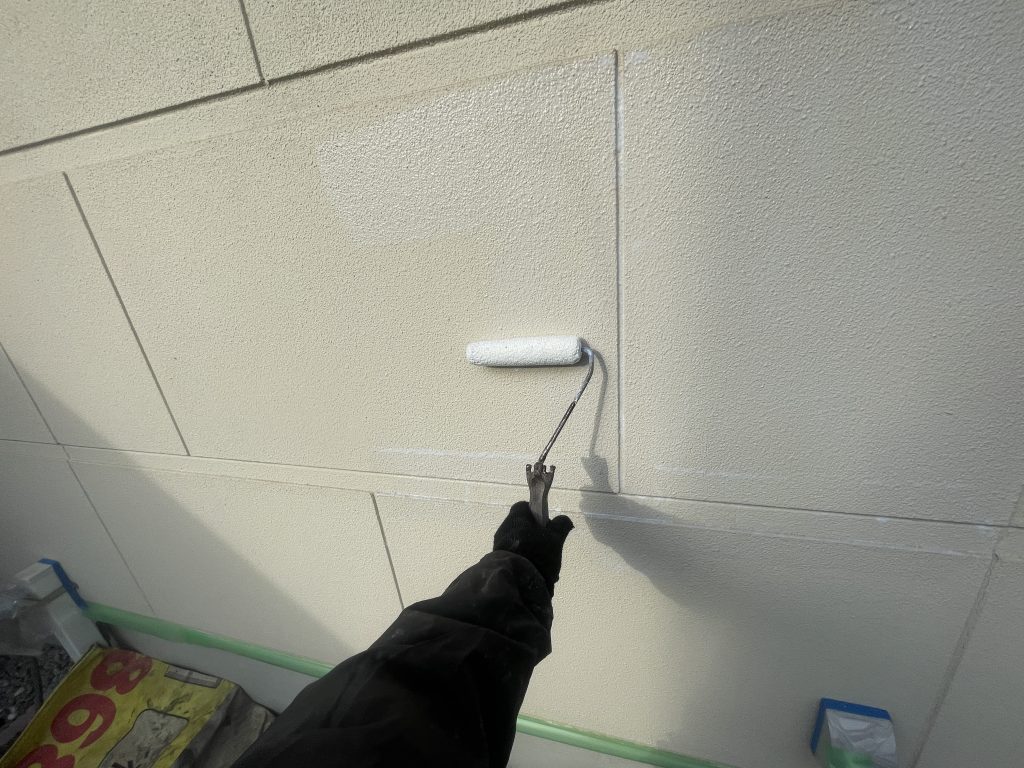 本日は足場着工前の工程として、外壁の一部に試し塗りを行い、シーラーを塗布しました。