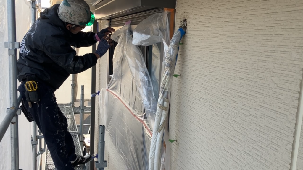 窓やサッシ、玄関まわりなど、塗料が付着してはいけない箇所を中心に、ビニールやマスキングテープを使ってしっかりと覆っていきます。