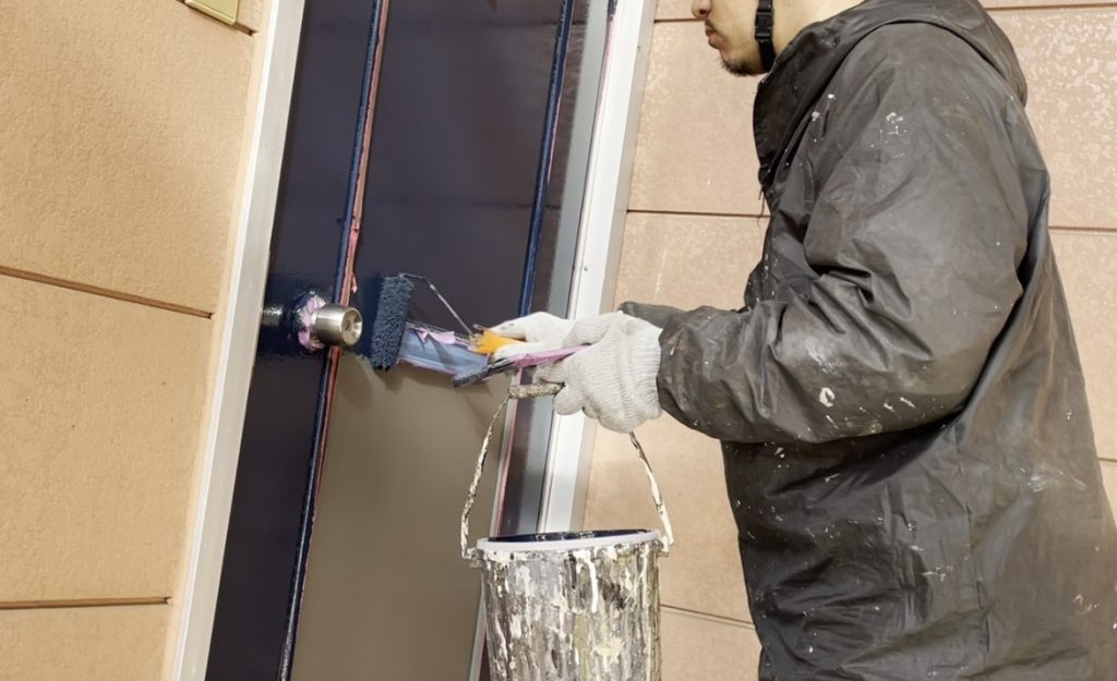 玄関ドアの上塗り作業