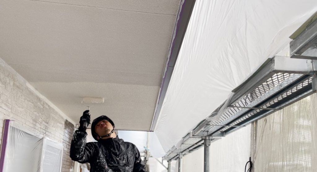 軒天井の上塗り作業