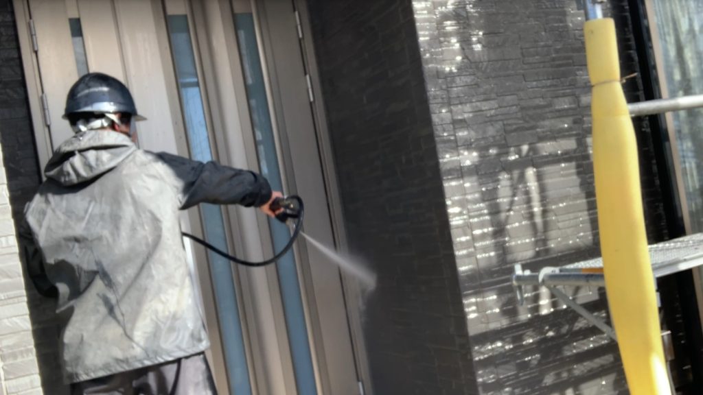塗装工事に入る前の下準備として、外壁に付着している汚れを徹底的に除去していく重要な工程です。