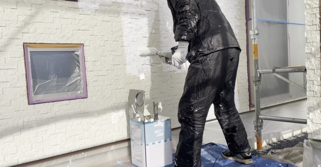 外壁の状態を確認しながら、ローラーと刷毛を使い分けて下塗り材を塗り込んでいきました。