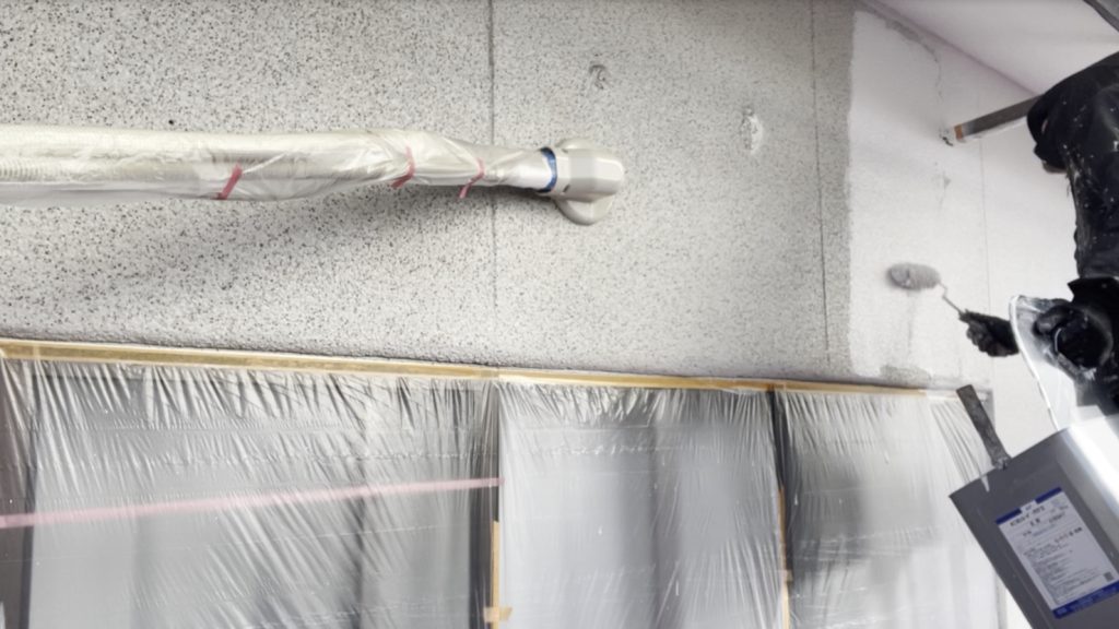 本日は外壁の中塗り作業を行い、上塗りとは異なる色で施工しました。