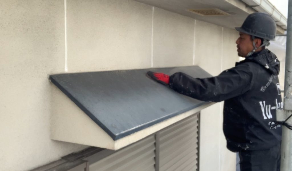 庇は金属製のため、表面が滑らかで塗料が密着しにくい部位です。
