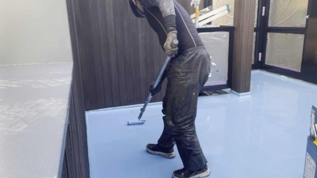 【高松市】ベランダ防水・主材工程|ウレタン樹脂2回目!雨漏りを許さない「強靭な防水層」の完成