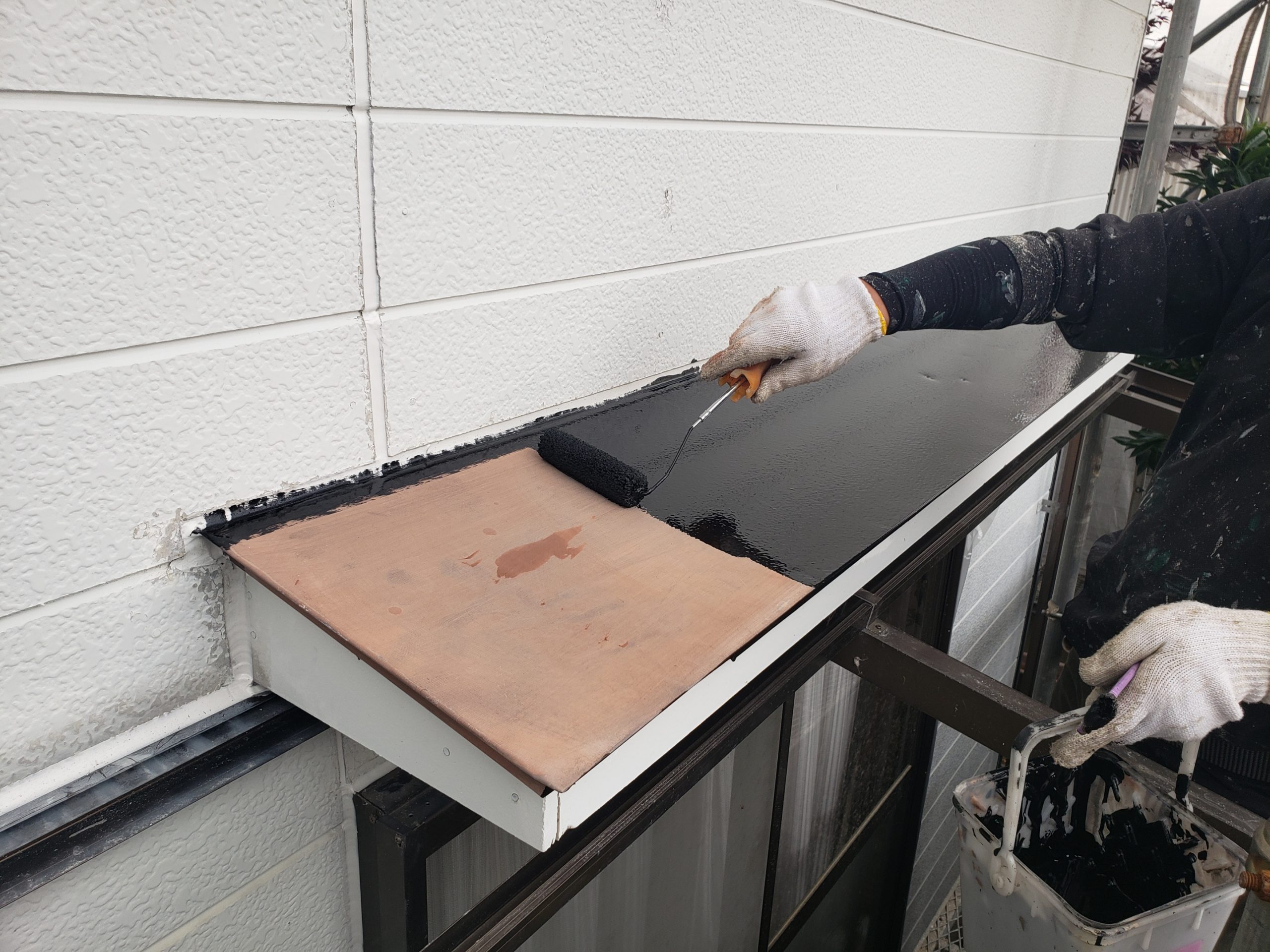 付帯鉄部分の下塗りになります。錆止め塗料を使用し、錆の発生を防ぎます。