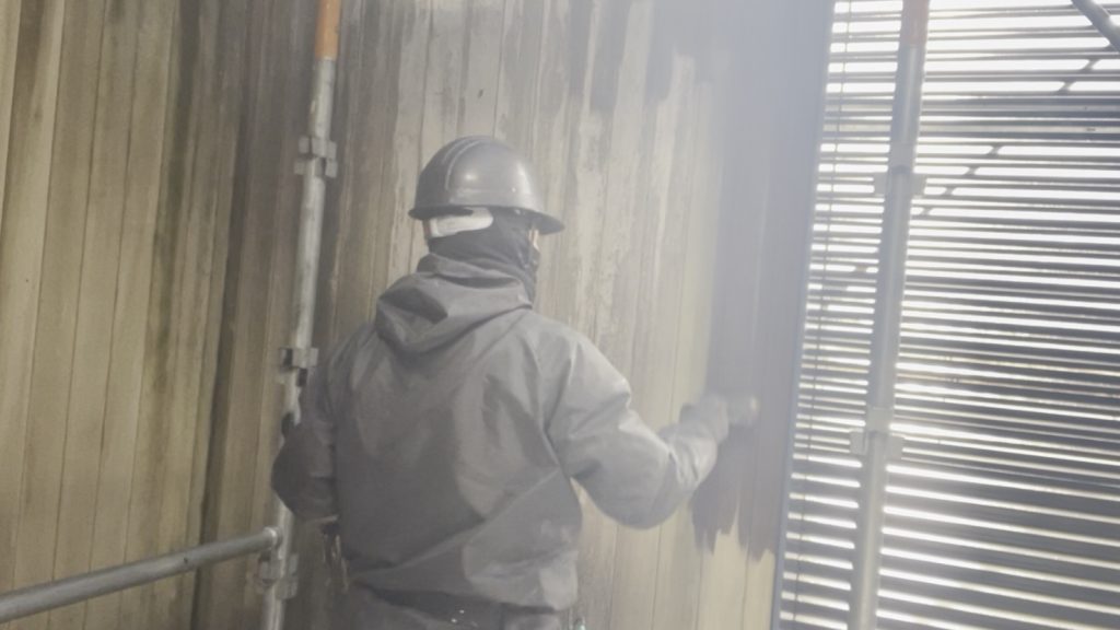 * 作業内容:羽目板(木部)へのノンロットブルーノ1回目塗装。