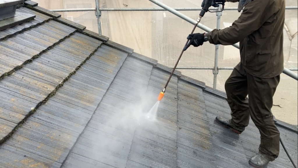 水圧の当て方を調整しながら、屋根材を傷めないよう注意して作業しました。