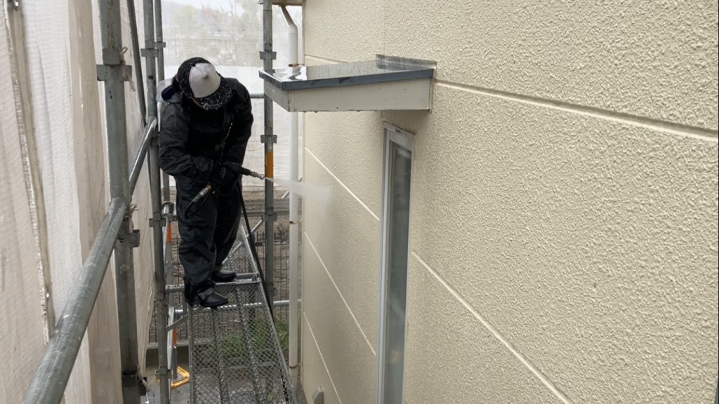 高圧洗浄でしっかりと表面の粉を洗い流し、健全な下地状態に整えていきます。