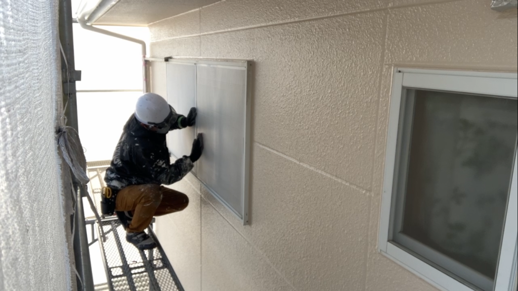 今回の雨戸は凹凸の少ない平面タイプのため、吹き付け塗装は行わず窓に取り付けたままローラーで仕上げていきます。