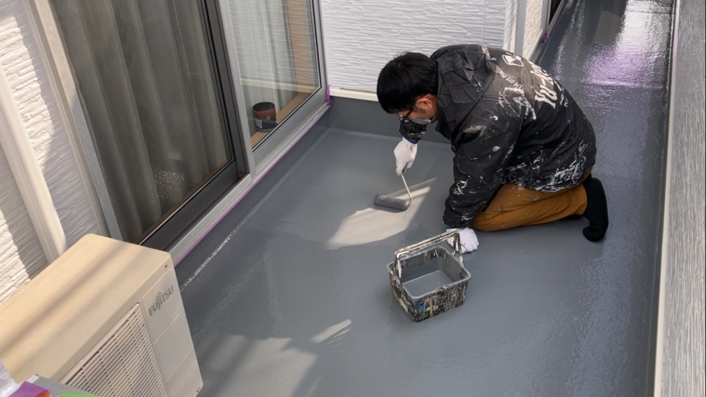ベランダでは防水トップコートの上塗り作業を行いました。