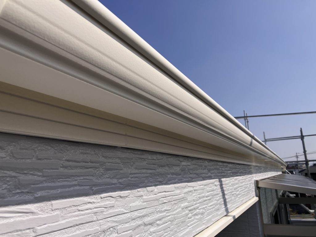 雨樋や水切り、各種付帯部は白系色の5分艶で仕上げています。