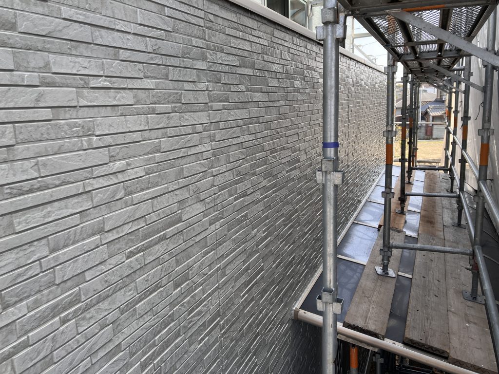 目地色と凸部の色を分けることで、外壁材の柄を活かした立体感のある仕上がりになりました。