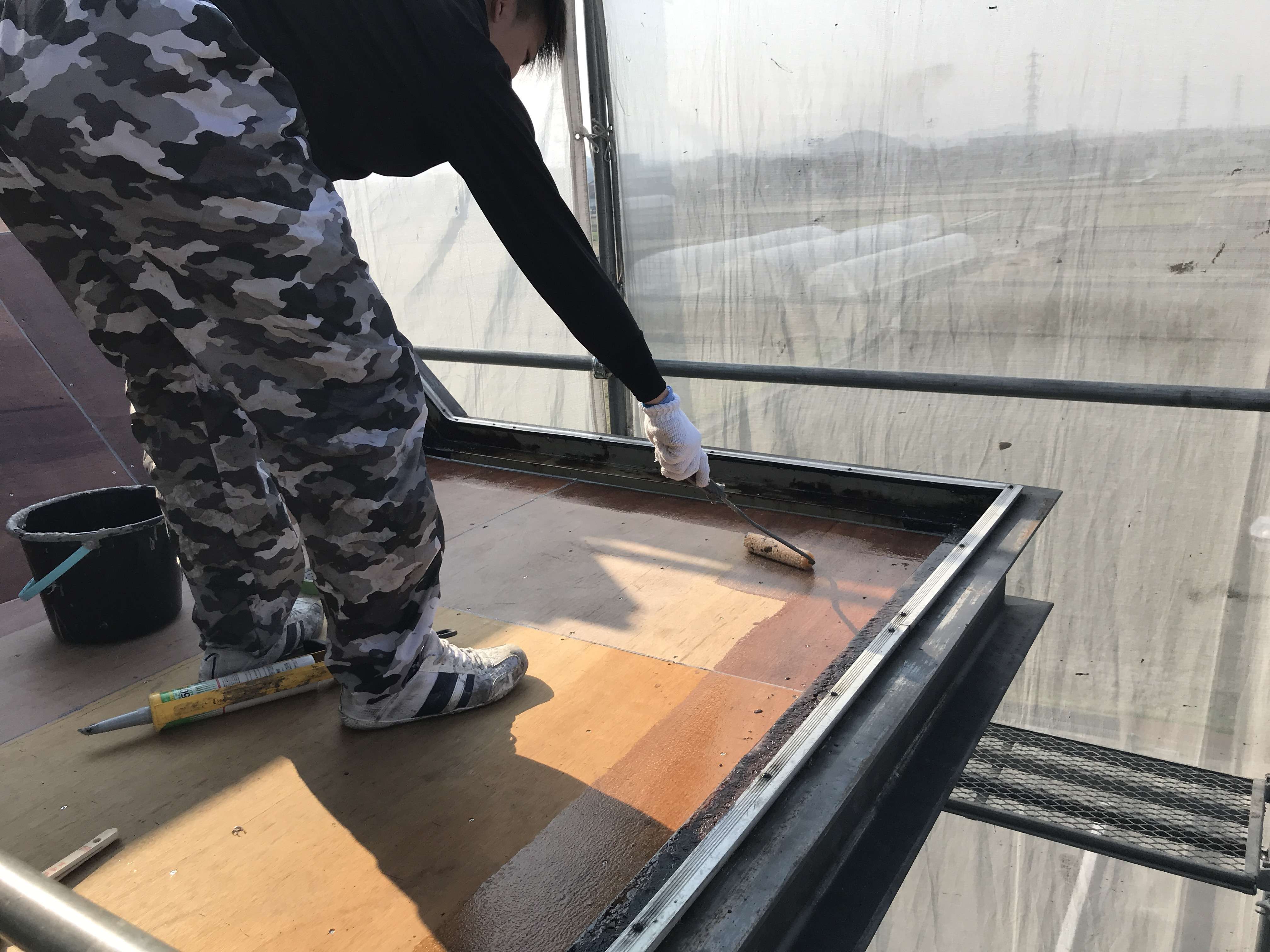 下屋根防水工事の下塗りプライマーになります。防水材の密着性を高める為にたっぷりと塗り込みます。