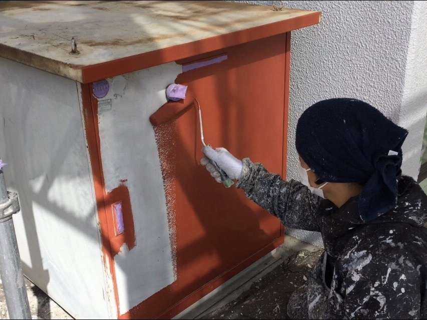 貯水タンクや鉄骨の錆止めになります。錆の進行を防ぐ為にたっぷりと塗り込みます。