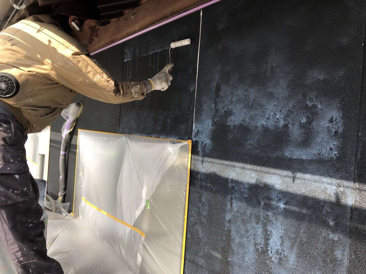 モルタル壁の塗装の為、塗料が付着しないようにしっかり養生します。