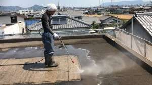 陸屋根と外壁の高圧洗浄です。コケ、汚れをしっかり除去していきます。
