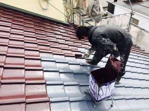 セメント瓦の中塗り作業です。 エーエスペイントのXトップを塗っています。