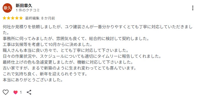 何社か見積りを依頼しましたが、ユウ建装さんが一番分かりやすくとても丁寧に対応していただきました。 事務所に伺ってみましたが、雰囲気も良くて、総合的に検討して契約しました。 工事は気候等を考慮して10月からに決めました。 職人さんも本当に良い方々で、とても丁寧に対応して下さいました。 日々の作業状況や、スケジュールについても適切にタイムリーに報告してくれました。 最終仕上げの色も急遽変更しましたが、機敏に対応して下さいました。 古い家ですが、まるで新築のように生まれ変わってとても喜んでいます。 これで気持ち良く、新年を迎えられそうです。 本当にありがとうございました。