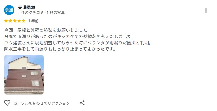 今回、屋根と外壁の塗装をお願いしました。 台風で雨漏りがあったのがキッカケで外壁塗装を考えだしました。 ユウ建装さんに現地調査してもらった時にベランダが雨漏りだ箇所と判明。 防水工事をして雨漏りもしっかり止まってよかったです。