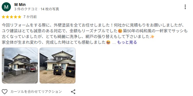 今回リフォームをする際に、外壁塗装を全てお任せしました!何社かに見積もりをお願いしましたが、ユウ建装はとても誠意のある対応で、金額もリーズナブルでした☺️築50年の純和風の一軒家でサッシも古くなっていましたが、とても綺麗に洗浄し、網戸の張り替えもして下さいました✨ 家全体が生まれ変わり、完成した時はとても感動しました🥹 仕事も丁寧で、本当に信頼できるので みなさんに是非お勧めします😊‼️ ユウ建装さん、大変お世話になりありがとうございます