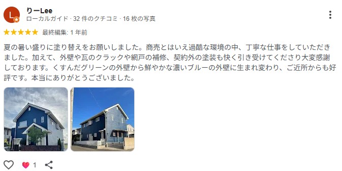夏の暑い盛りに塗り替えをお願いしました。商売とはいえ過酷な環境の中、丁寧な仕事をしていただきました。加えて、外壁や瓦のクラックや網戸の補修、契約外の塗装も快く引き受けてくださり大変感謝しております。くすんだグリーンの外壁から鮮やかな濃いブルーの外壁に生まれ変わり、ご近所からも好評です。本当にありがとうございました。