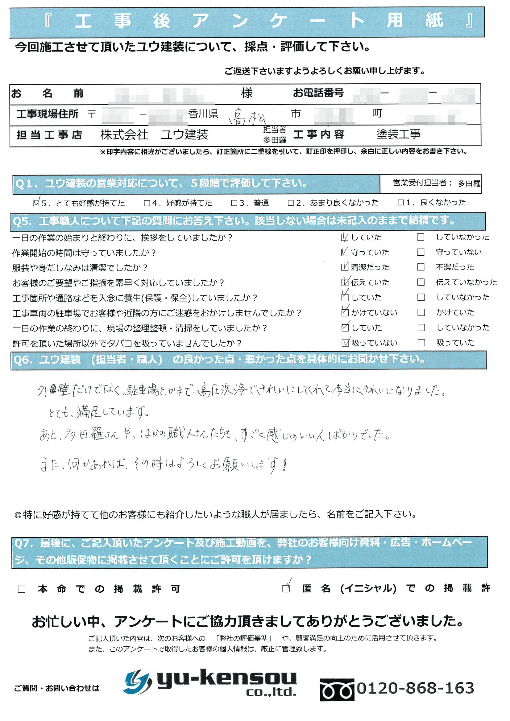 外壁だけでなく駐車場とかまで高圧洗浄できれいにしてくれて本当にきれいになりました。 とても満足しています。 あと、多田羅さんやほかの職人さんたちもすごく感じのいい人ばかりでした。 また何かあればその時はよろしくお願いします!