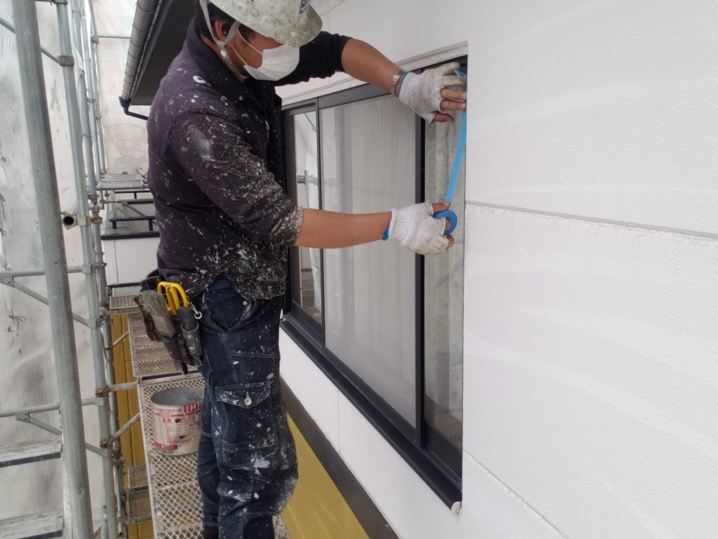 サッシ等にマスキングテープで養生を行い、シーリング材が付着するのを防ぎます。