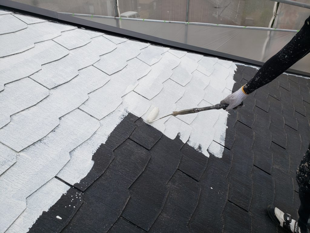屋根の下塗りになります。シーラーをたっぷりと塗り込み、塗料の密着性を高めます。