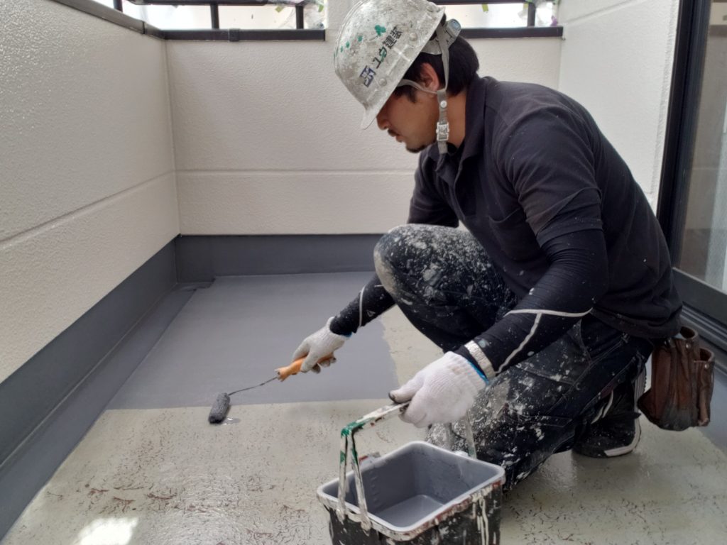 ベランダ防水の上塗りになります。塗料をたっぷり塗り込み、防水層を紫外線から守ります。