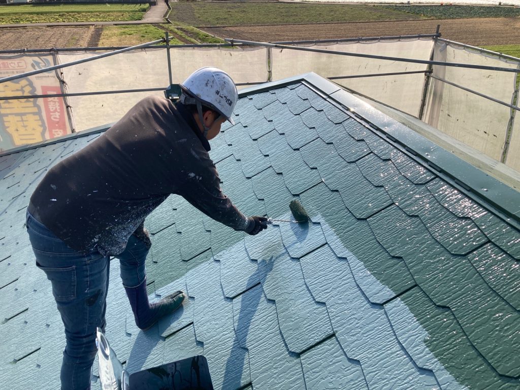 屋根の上塗りになります。塗料をたっぷりと塗り込み、紫外線や雨等から屋根を守ります。