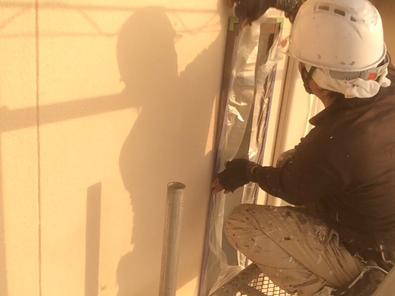 塗装前の養生作業です。 塗装しない部分をビニール等で覆っていきます。