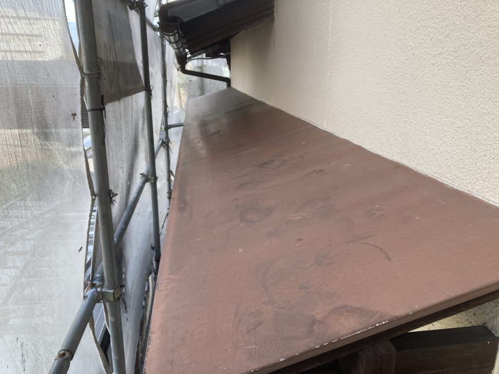 庇板金の上塗りになります。 サッシに合わせた茶色で塗装していきます。