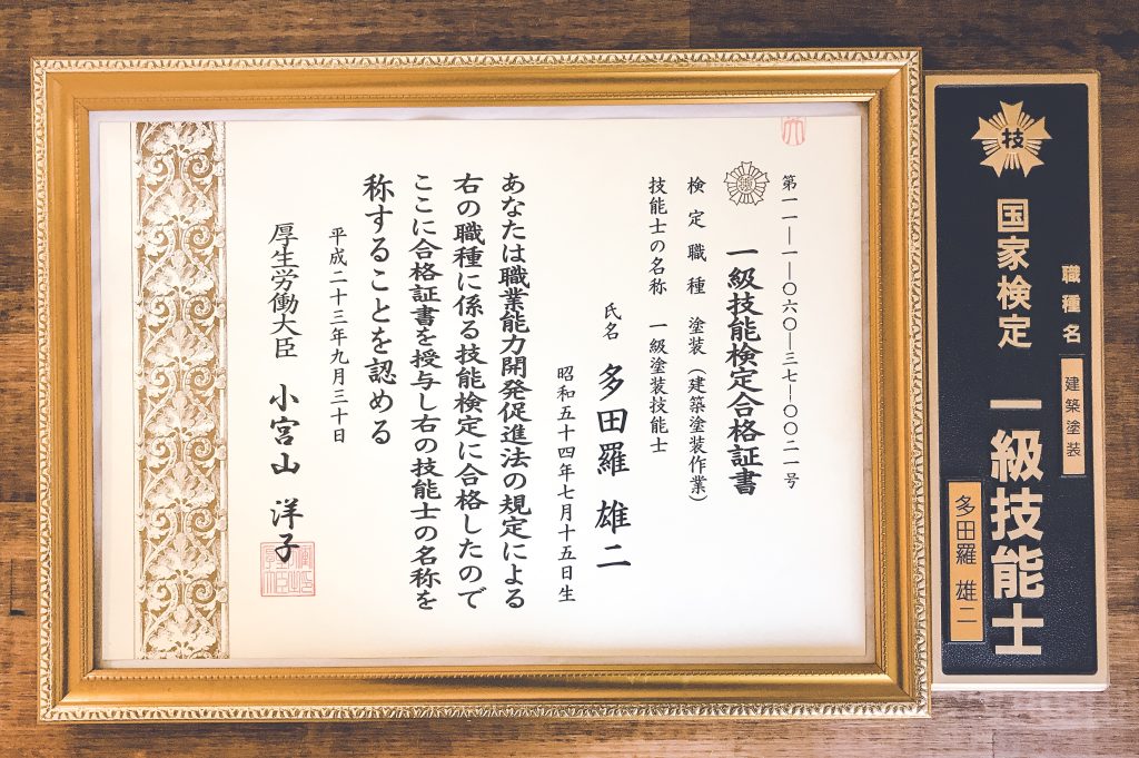 厚生労働大臣認定の国家資格「一級塗装技能士」も多数在籍しております。